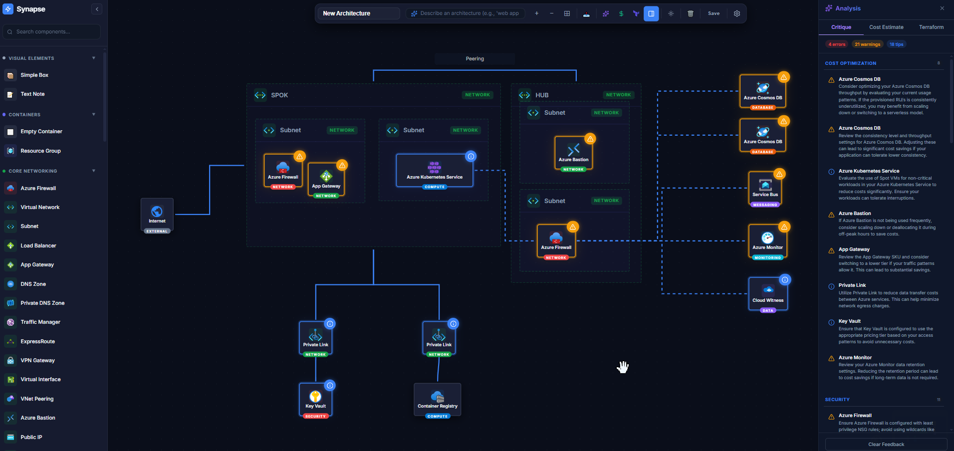 Synapse scans your architecture , acting as an automated Senior Architect. It suggests better services for your specific workloads and flags vulnerabilities in real-time.